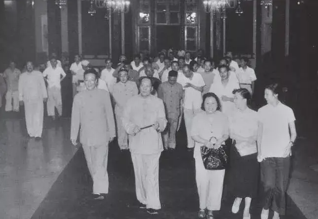 图一:1957年 7月 7日夜,团桌座谈会结束后,毛泽东与 36位各界人士步出会议室,走在前往小剧场观看越剧《追鱼》的大厅通道中。(徐大刚摄)