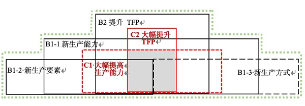 两个必要条件。必要条件一是至少要满足如下3个条件之一。(1)B1-1:提高了生产能力,产品包括已有产品、改善的产品、新的产品和促进公平与绿色等高质量发展的产品。(2)B1-2:生产上利用了新的生产要素,包括能力得到提升的劳动者、质量安全等得到改善的生产要素和新的生产要素(例如,数据、信息、知识、新技术等)。(3)B1-3:生产上采用了新的生产方式,是“劳动者、劳动资料、劳动对象”的“优化组合”及其“体制机制创新”等的体现。必要条件二是新的全要素生产率必须高于旧的全要素生产率。实践中可以通过“科技创新和改革创新”等促进新的生产要素和新的生产方式等采用来提高全要素生产率。新质生产力的内涵范围见图1中外围。