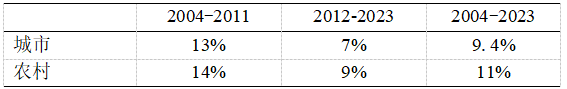 值得注意的是,城乡居民可支配收入差距在2012年之后的降低,与城市居民可支配收入增长放慢有关(表5)。与2004年至2011年相比,2012年至2023年的农村居民可支配收入的平均增速降低了5个百分点,但因为城市居民可支配收入的平均增速更快降低,所以导致城乡居民可支配收入差距变小。这种变化不值得我们称道。