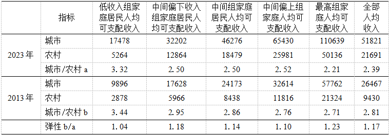 进一步分析可发现一个更令人忧虑的情况:2012年以后,农村低收入人群可支配收入平均增速较之其他群体明显偏低(见表6)。2023年城乡居民人均可支配收入缩小至2.39倍,但在城乡居民按五等份划分的各组中,比较城乡同为低收入组的居民人均可支配收入,其差距倍数从2013年到2023年仅从3.44倍下降到3.32倍。与其他各组比较,倍数变化弹性最小,为1.04,而倍数变化弹性最大的竟然是高收入组,达到1.23!这意味着占比为20%的乡村最低收入人群与城市同一组的人群相比,其收入差距变化不大;反倒是城乡占比为20%的最高收入的人群的收入差距明显缩小。一般来说,收入差距存在未必不合理,但问题是中国在这一时期的脱贫攻坚任务所要帮助的正是这一部分人。