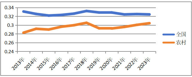 上述情况也被基尼系数分析所证明。用5等分划分的家庭的可支配收入作为基尼系数分析的对象有一定局限性,但仍可以反映收入差距变动的大略趋势。如图3显示,2012年至2023年间,乡村居民收入差距的基尼系数是扩大的,由0.28256提高到0.30417;而反映不分城乡的全国居民的收入差距的基尼系数则由0.3309降低到0.3242。这说明,在全国收入分配的基尼系数降低的背景下,农村居民收入分配的基尼系数反而扩大了。虽然两者变动幅度都不大,但在政府大抓脱贫攻坚工作的这一时期,乡村居民收入分配差距不降反升,多少有些令人吃惊。从效率与平等(平均)的关系看,农村收入分配的基尼系数的提高,应该换来农村经济效率的更快提高,但实际情况如前所述,农村三种粮食生产的劳动生产率增速反而出现低于全国增速的变化。这种效率变化与收入差距变化的异常匹配,可能反映了经济结构出现了深层次问题。